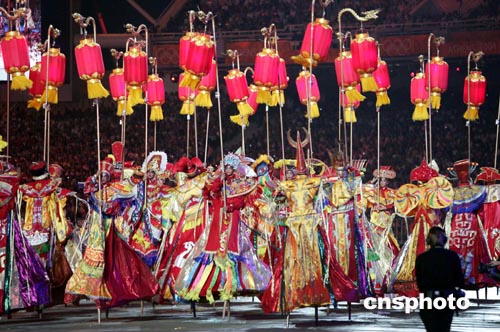 二十八名來自嵩山少林寺武術學校的學員腳踩高蹺,手中挑著二十八只大紅燈籠,在演出中心區穿行表演,傳遞中國人民歡迎奧運會的熱情。