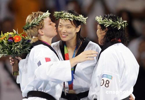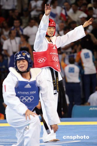 當?shù)貢r間八月二十九日,中國選手陳中在雅典奧運女子六十七公斤以上級跆拳道決賽中戰(zhàn)勝法國選手獲得冠軍。中新社記者:毛建軍