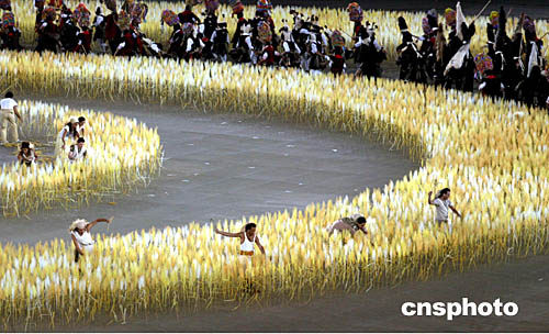 圖為在當地時間8月29日舉行的雅典奧運會閉幕式中,表演者表演小麥豐收的鏡頭。