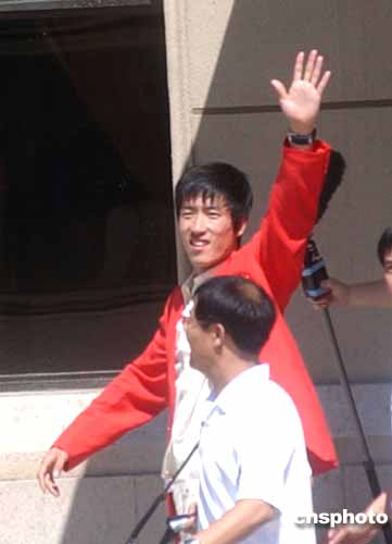 中國飛人、奧運110米欄冠軍劉翔向在北京首都國際機場歡迎的民眾揮手致意。中新社記者:武仲林