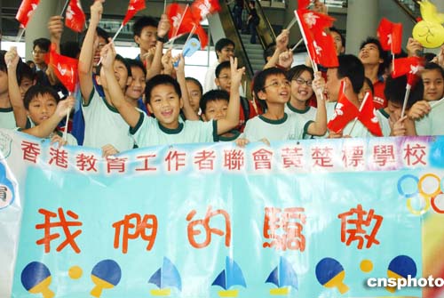 在香港國(guó)際機(jī)場(chǎng)舉行的歡迎儀式上,眾多香港小朋友舉著標(biāo)語熱烈歡迎香港奧運(yùn)代表團(tuán)返港。作者:錢興強(qiáng)