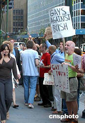 美東時間九月一日中午,紐約一百多名同性戀者聚集在共和黨代表準備就餐的餐廳門口,打著“同性戀者反布什”的標語牌,抗議布什競選連任總統。年初起,布什不斷主張禁止同性婚姻。作者:龔文謨