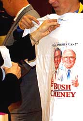 美國共和黨大會當(dāng)?shù)貢r間八月三十日至九月二日在紐約舉行,會場里出售的印有布什和切尼肖像的文化衫成為搶手貨。作者:趙海燕