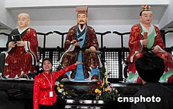 山東臨沂市是古代著名書法家王羲之的家鄉,為紀念其對中國文化的貢獻和表達后人對他的景仰,當地政府在王羲之幼年居住處重修了“王羲之故居”。圖為故居內王羲之(中)和他的書法弟子塑像。作者:王麗南