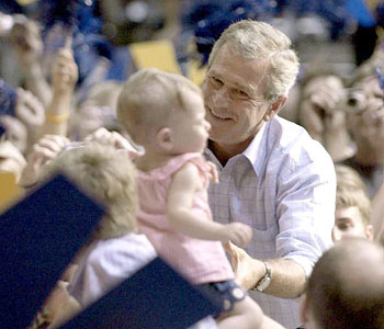 中新網9月5日電 據英國媒體報道,四年一度的美國總統大選是美國政治活動中最重要的節目。不論是共和黨,還是民主黨的總統候選人都會想盡一切辦法在選民面前展示自己的良好形象和領導能力。對于他們來說,選民們的“可愛貝貝”是表現其親和力的重要工具。以上就是媒體捕捉到的布什總統在競選活動中拿“可愛貝貝”作秀的精彩鏡頭。(固山)