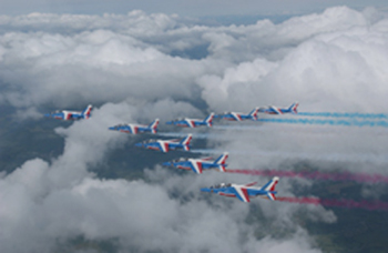每年7月14日法國國慶日的巴黎上空、著名的勒芒24小時汽車大將賽、法國網(wǎng)球公開賽和一級方程式賽車場的上空,都能看到法蘭西巡邏兵8機編隊拉出的紅白藍三色煙跡。它幾乎已經(jīng)成了法國重大場合不可缺少的儀仗隊,是法國的空中親善大使。