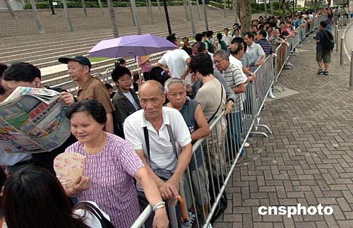 由五十位中國奧運金牌選手和香港當紅藝人聯袂奉獻的大匯演定于晚間七點正式開始,但不到下午三點,匯演地點大球場外已經有超過二百名香港市民冒酷暑、頂烈日在排隊“霸位”。他們個個“裝備齊全”,帶了水、遮陽傘和面包點心,說起來看奧運健兒表演,都有掩飾不住的喜悅與興奮之情。