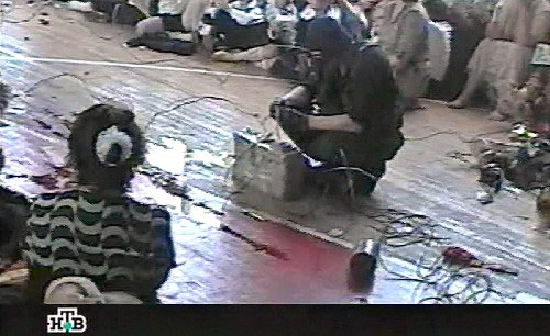 由武裝分子拍攝的錄相帶中,出現了攜帶重型武器的一名蒙面男子和一名婦女,他們頭上戴著阿拉伯款式的頭罩。幾百名人質坐在健身室內。