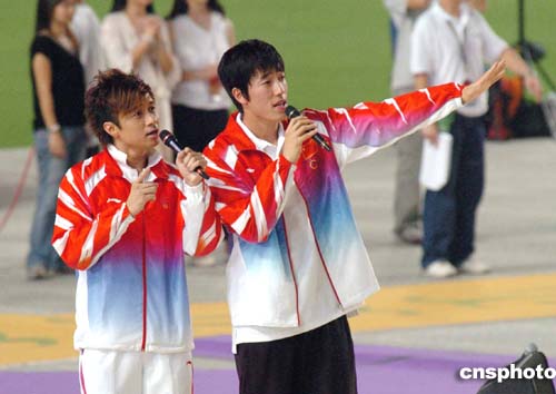 圖為香港歌星古巨基與劉翔高歌一曲。作者:洪少葵