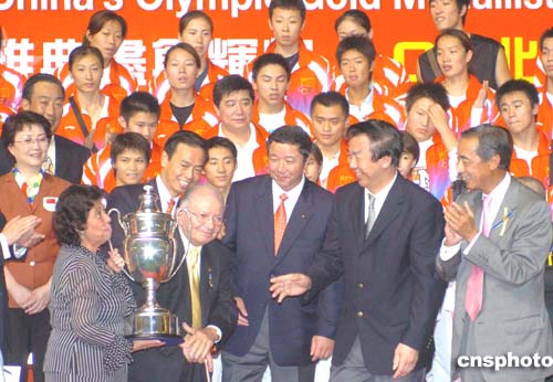 馬會(huì)搭設(shè)的頒獎(jiǎng)臺(tái)上,寫有“0四雅典盡創(chuàng)輝煌,0八北京再顯鋒芒”的字樣,表達(dá)了馬會(huì)的愿望。代表團(tuán)團(tuán)長(zhǎng)、國(guó)家體育總局局長(zhǎng)袁偉民頒發(fā)了獎(jiǎng)杯,而全體金牌運(yùn)動(dòng)員則登上頒獎(jiǎng)臺(tái),列席頒獎(jiǎng)儀式。在此之前,全體金牌運(yùn)動(dòng)員還在一匹駿馬雕塑上簽名留念。