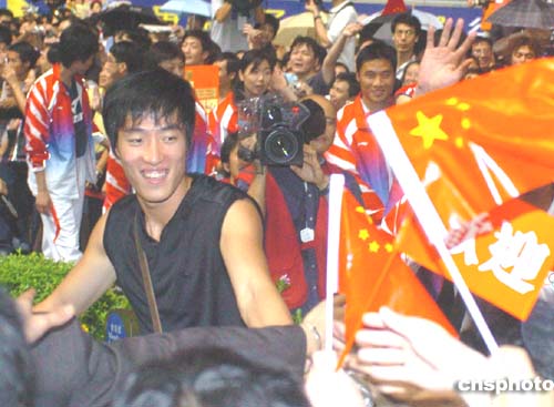 今天晚上的跑馬地馬場(chǎng),吸引了超過(guò)三萬(wàn)的觀眾。馬迷們熱情洋溢,揮動(dòng)著國(guó)旗及寫有“歡迎”字樣的條幅,迎接中國(guó)奧運(yùn)金牌得主的到來(lái)。很多郭晶晶、田亮的FANS,更是把亮晶晶的名字寫得大大的,亮亮的,格外引人注目。當(dāng)代表團(tuán)一行走進(jìn)馬場(chǎng),頓時(shí)爆發(fā)出熱烈的歡呼聲。人們喊著各自喜愛(ài)的運(yùn)動(dòng)員的名字,氣氛極盡熾熱。