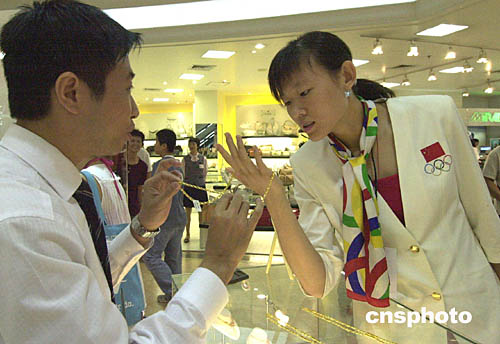 中國雅典奧運金牌選手代表團九日抵達澳門訪問,當天下午部分選手到商場購物,跆拳道金牌選手羅微在選購金飾。作者:梁永強