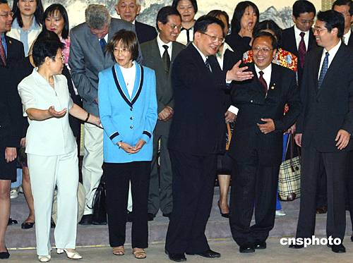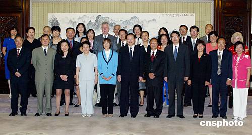 九月十日,國務委員唐家鏇在北京中南海紫光閣會見美加參政華人訪華團全體成員。國務院僑辦主任陳玉杰(左前一)、副主任許又聲(右前一)陪同會見。中新社記者:鄭萍萍