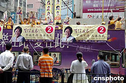 香港立法會選舉投票日即將舉行,選舉氣氛愈演愈激烈。9月10日,立法會選舉港島候選人范徐麗泰出動巴士在鬧市宣傳。作者:洪少葵