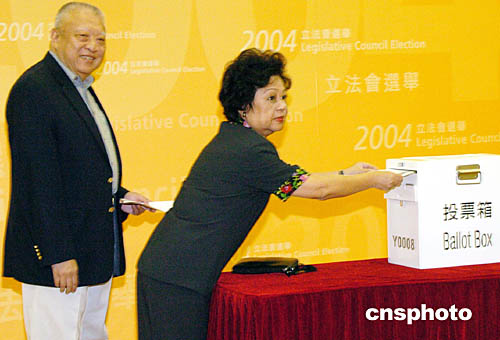 中新社香港九月十二日電(記者陶社蘭)香港特區(qū)第三屆立法會(huì)選舉今天進(jìn)行投票,全港五百零一個(gè)投票站今早七時(shí)三十分至晚上十時(shí)三十分開放,供逾三百二十萬(wàn)名選民投票。香港特區(qū)行政長(zhǎng)官董建華及其他官員參加投票,履行公民的職責(zé)。