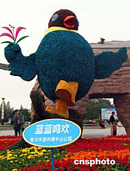 第十三屆金雞百花獎電影節將于九月十六日在寧夏首府銀川舉行。在銀川市的光明廣場,本屆電影節吉祥物、寧夏回族自治區的區鳥藍馬雞“藍藍”在花叢中異常顯眼。作者:劉呈軍