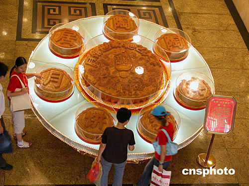 中秋將至,有“月餅泰斗”之稱的廣州陶陶居酒家推出巨無霸月餅“七星伴月”,中間的大月餅直徑達168厘米、重318公斤。作者:劉衛勇