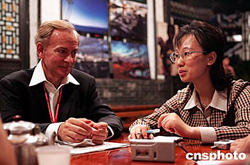 中法兩國(guó)文化交流日益密切。九月十七日,法國(guó)駐華大使館文化專員白尚化(左)在與中新社記者交談平遙國(guó)際攝影大展的所見所聞。作者:張?jiān)?