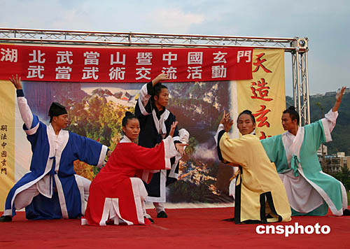 此次訪臺(tái),交流團(tuán)攜《妙手太極》、《紫宵晨練》、《太極玄功》、《八卦神韻》、《綿掌》、《逍遙拳》等十二個(gè)傳統(tǒng)或現(xiàn)代武術(shù)套路。成員多是來自武當(dāng)山及十堰市的武術(shù)高手,包括武當(dāng)山道教武術(shù)院院長鐘云龍。另外還有六名十歲左右的小“武術(shù)家”,個(gè)個(gè)身手非凡。其中一位今天表演鐵頭功時(shí),在場民眾嘖嘖稱贊。