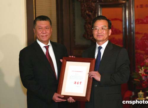 中新社北京九月二十日電(記者董會峰)國務院總理溫家寶二十日下午在中南海紫光閣親切會見了澳門特別行政區(qū)行政長官何厚鏵,并向他頒發(fā)了任命他為澳門特別行政區(qū)第二任行政長官的國務院令。