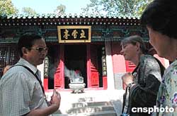九月二十一日,導游在剛剛竣工的少林寺立雪亭前給游客講解。中國嵩山少林寺整修工程近日竣工,過去僅能容納三千多人的少林寺整修后可同時接納一萬人游覽。今年三月份,鄭州市政府開始全面對少林寺進行整修。整修內容除包括擴建青石廣場,寺院內地面磚、消防通道等建設外,還恢復東西八座殿堂的歷史原貌以及殿宇樓閣的重新粉飾添彩等多項工程。這次少林寺整修工程共鋪設青磚地面近一萬平方米,恢復建筑面積一千六百平方米,新建東僧房建筑面積近一千五百平方米。作者:慎重