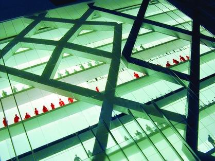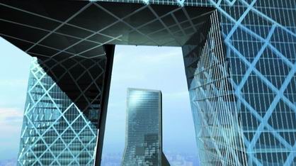 CCTV主樓的兩個塔樓從一個共同的平臺升起,在上部匯合,形成三維體驗,突破了摩天樓常規的豎向特征的表現。復雜的功能包容在內部緊密連接的環路中,體現一個相互合作、相互依存的鏈條以及自身組織的有序和協調。