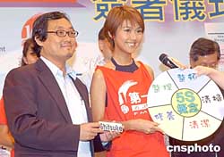 歌星許志安9月23日在香港出席由職業安全健康局、勞工處及香港電臺聯合舉辦「精靈一點---職業衛生約章簽署儀式」記者會,助理廣播處長邵盧善向「職安健大使」許志安頒贈紀記品。作者:鄧慶樂