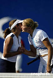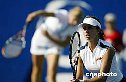 九月二十五日,中國網球公開賽女子雙打比賽繼續在北京網球中心進行,在中央球場進行的女雙半決賽中,俄羅斯選手薩芬娜(右)與瑞士選手加格里亞蒂二比一戰勝中國選手、雅典奧運會網球女子雙打冠軍李婷和孫甜甜,順利晉級決賽。作者:盛佳鵬