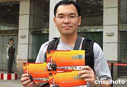第一位領取參觀票的歐陽先生二十五日晚八時許就開始排隊,他準備和父母一起去參觀。作者:梁永強