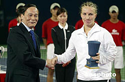 九月二十六日晚,中國網球公開賽女子單打決賽在北京網球中心中央球場進行,美網新后、俄羅斯名將庫茲涅佐娃一比二不敵賽會頭號種子選手、美國網壇名將小威廉姆斯,屈居亞軍。圖為比賽結束后北京市長王岐山(左)為庫茲涅佐娃頒發亞軍獎杯。中新社記者:盛佳鵬