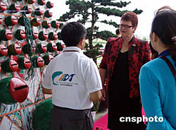 南通別具特色的民間藝術,引起正在該市參加首屆世界大城市帶高層論壇嘉賓們的興趣。圖為新西蘭前總理希普利在饒有興趣地觀賞南通的哨口風箏表演.作者:王曉紅