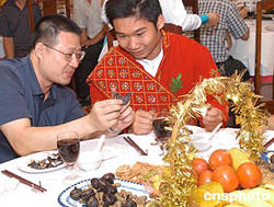 九月二十七日晚,來自近三十個國家和地區的一百多名華裔留學生聚集在廣州荔灣湖畔的泮溪酒家,參加廣東省僑辦舉辦的中秋聯誼會,品嘗有名的“廣州泮塘五秀”——菱角、馬蹄、蓮藕、茨菰、茭筍。圖為華裔留學生在學習食用方法。作者:羅仰明