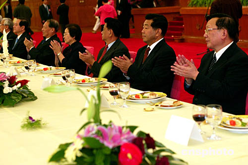 全國政協、中央統戰部九月二十八日在北京舉行招待會慶祝中華人民共和國成立五十五周年,全國政協主席賈慶林、國務委員唐家璇等出席招待會。中新社記者:滿會喬