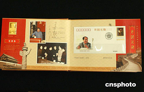 在中華人民共和國成立五十五周年之際,由國家郵政局主辦、中國郵票博物館協辦的“《開國元勛》金銀郵品典藏冊首發式九月二十九日在北京人民大會堂舉行。《開國元勛》金銀郵品典藏冊內含十五位開國元勛形象的純金銀郵票。其中毛澤東、周恩來、劉少奇、朱德、任弼時、鄧小平、陳云、等七枚金郵票,總含13克999純金;彭德懷、劉伯承、賀龍、陳毅、羅榮桓、徐向前、聶榮臻、葉劍英等八枚銀郵票,總計含16克純銀。中新社記者:鄒憲
