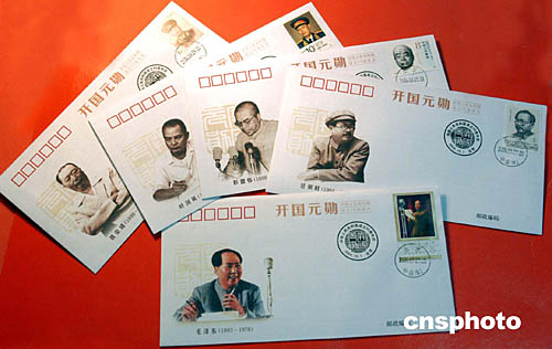 | 在慶祝中華人民共和國(guó)成立五十五周年之際,中國(guó)郵票博物館九月二十九日出品發(fā)行了一套十五枚《開(kāi)國(guó)元?jiǎng)住方佡|(zhì)紀(jì)念封。《開(kāi)國(guó)元?jiǎng)住方佡|(zhì)紀(jì)念封其中印有毛澤東、周恩來(lái)、劉少奇、朱德、任弼時(shí)、鄧小平、陳云、彭德懷、劉伯承、賀龍、陳毅、羅榮桓、徐向前、聶榮臻、葉劍英等開(kāi)國(guó)元?jiǎng)椎纳顖D象和貼有相應(yīng)肖像郵票。這套絹質(zhì)紀(jì)念封也被收納在中國(guó)郵票博物館于當(dāng)日發(fā)行的《開(kāi)國(guó)元?jiǎng)住方疸y郵品典藏冊(cè)之中。中新社記者:鄒憲