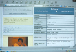 在這個(gè)名為“Friendster”的征友網(wǎng)站上,陳冠希用自己英文名“Edison”征友,在網(wǎng)上不僅有他詳細(xì)的資料,還有他6張生活照片,從照片的拍攝角度來(lái)看,應(yīng)該是陳冠希用網(wǎng)絡(luò)攝像機(jī)自己拍攝的,一向搞怪的陳冠希在網(wǎng)絡(luò)世界也不愿放棄作秀機(jī)會(huì),6張照片既有成熟穩(wěn)重的模樣,也有扮猩猩、吐舌頭的怪相,甚至有陳冠希向網(wǎng)友送上香吻的照片,極為搞笑。