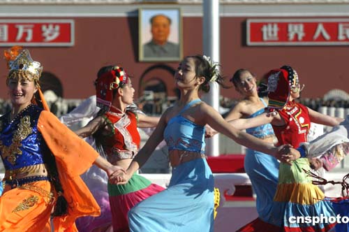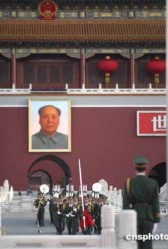二○○四年十月一日,北京天安門廣場舉行了隆重的國慶升旗儀式,慶祝國慶五十五周年。中新社記者:盛佳鵬