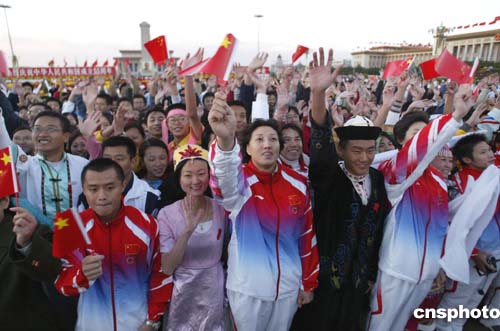 雅典奧運會跳水冠軍彭勃(左一)、排球選手王麗娜(左三)等與首都大學(xué)生一起參加升旗儀式。中新社記者:盛佳鵬