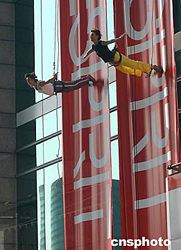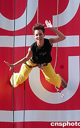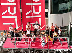 穿上時尚品牌ESPRIT 2004秋冬運動時裝的模特,10月4日在香港尖沙咀美麗華商場外墻舞臺上表演,展示優美姿態,為該品牌運動系列宣傳。作者:洪少葵