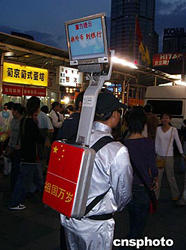 時下,廣告幾乎在上海無孔不入。圖為國慶黃金周之夜,身背多媒體液晶顯示器的廣告人在上海徐家匯人群密集地帶串街走巷。作者:潘索菲