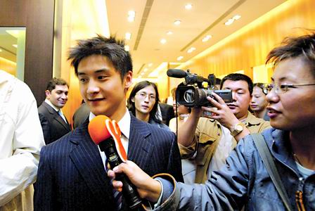當“跳水王子”身著筆挺的意大利西裝走到簽到臺前時,記者們瘋了似地沖將過去,電視臺的編導激動地將話筒伸到田亮嘴邊,讓他說說郭晶晶,談談港商。雙眼略顯紅腫的田亮在經(jīng)紀人的保護下低頭讓過,對任何問題不予應答。經(jīng)紀人劉先生稱,田亮剛剛從美國乘坐了34個小時的飛機到達北京,其間轉乘了4個航班,非常勞累,因此不便接受采訪。(記者 胡雪柏王錚)