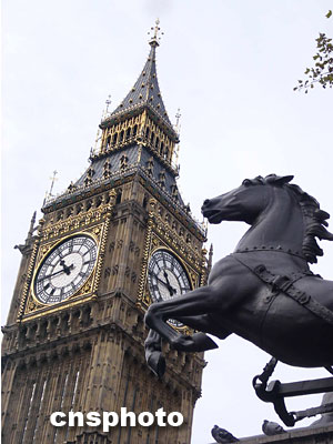 圖為倫敦的標(biāo)志之一——大本鐘(Big Ben)。畫面前方是西敏橋(Westminster Bridge)西側(cè)的戰(zhàn)馬雕塑。余瑞冬 攝