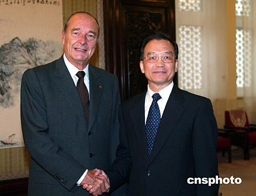 國務院總理溫家寶十月十日在北京會見法國總統希拉克。中新社記者:滿會喬