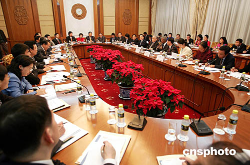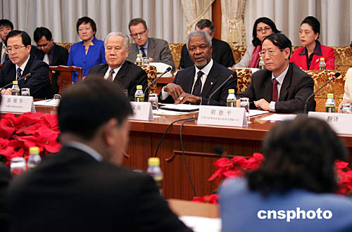 聯(lián)合國秘書長安南十月十一日在北京釣魚臺(tái)國賓館與中國企業(yè)家聯(lián)合會(huì)會(huì)長陳錦華(左二)、中國光彩事業(yè)促進(jìn)會(huì)副會(huì)長胡德平(右一)等中國企業(yè)家代表座談,共同探討“企業(yè)承擔(dān)的社會(huì)責(zé)任”等問題。