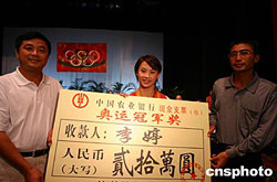 廣西自治區政府十月十一日在南寧舉行慶功會,獎給第二十八屆奧運會女子十米雙人跳臺冠軍李婷三十萬元人民幣。桂林一家企業獎給李婷二十萬元人民幣和一套價值百萬元人民幣的別墅。廣西另一名獲得獎牌的運動員周密也獲得政府獎勵十萬元人民幣。作者:蔣雪林