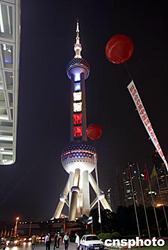 十月十一日,法國總統希拉克抵達上海訪問。上海浦東東方明珠電視塔用紅、藍、白三色彩燈迎接貴賓到訪。作者:潘索菲