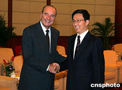 十月十一日晚,上海市長韓正在國際會議中心會見抵滬訪問的法國總統希拉克一行。作者:潘索菲