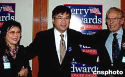 當地時間十月十三日,美國第一位華裔州長、華盛頓州州長駱家輝(中)前往紐約華埠,為民主黨總統候選人克里爭取亞裔選票。當晚,克里和布什進行了最后一場美國大選辯論。作者:趙海燕