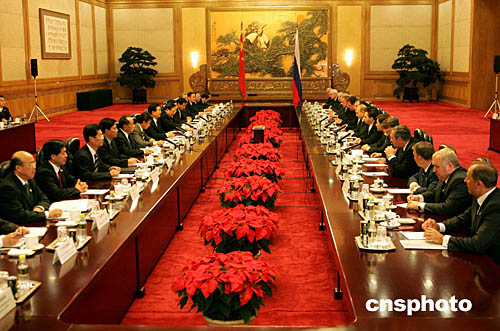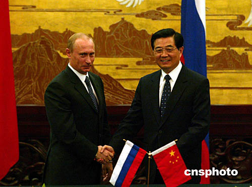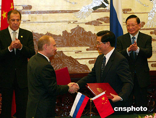 普京完全贊同胡錦濤的看法和建議,他說(shuō),發(fā)展俄中合作是俄一貫政策。《俄中睦鄰友好合作條約》為兩國(guó)關(guān)系發(fā)展奠定了重要基礎(chǔ),雙方解決邊境問題、就俄加入世貿(mào)組織達(dá)成協(xié)議是兩國(guó)戰(zhàn)略協(xié)作伙伴關(guān)系的體現(xiàn)。我們?cè)概c中方切實(shí)落實(shí)該條約的實(shí)施綱要,推動(dòng)雙方在各領(lǐng)域的合作。俄方希望加強(qiáng)經(jīng)貿(mào)合作,爭(zhēng)取在數(shù)量和質(zhì)量上均不斷提高。他重申,俄方關(guān)于同中國(guó)的能源合作的決定始終未變,也愿同中國(guó)加強(qiáng)在科技、人文等領(lǐng)域的合作。