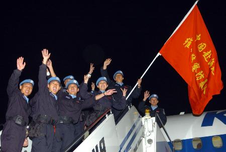 中新社北京十月十七日電 九十五名中國維和警察防暴隊成員今天乘聯合國專機從北京首都國際機場出發,前往海地執行聯合國維和任務。這是中國政府第一次向海地任務區派遣維和警察防暴隊。